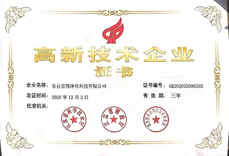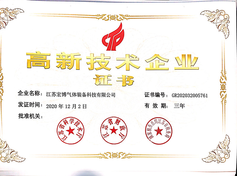 2020年,宏博企業(yè)江蘇宏博氣體裝備科技有限公司,生產(chǎn)基地-東臺宏博凈化科技有限公司同時獲評高新技術企業(yè),并于近日收到由江蘇省科學技術廳、江蘇省財政廳、國家稅務總局江蘇省稅務局聯(lián)合頒發(fā)的《高新技術企業(yè)證書》。