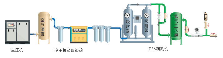 空壓機(jī)→空氣緩沖罐(濕罐)→C級過濾器→冷凍式干燥機(jī)→T級過濾器→A級過濾器→H級過濾器→制氮機(jī)主機(jī)→氮?dú)饬髁浚兌?,壓力檢測→氮?dú)鈨夤蕖褂命c(diǎn)