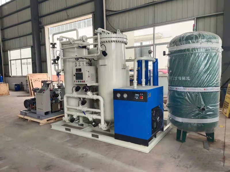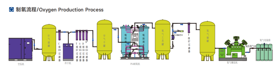 變壓吸附制氧裝置以潔凈的壓縮空氣為原料,采用高品質(zhì)的沸石分子篩作為吸附劑,在一定的壓力下,從空氣中制取氧氣。經(jīng)過純化干燥的壓縮空氣,在吸附器中進(jìn)行加壓吸附、減壓脫附。由于空氣動(dòng)力學(xué)效應(yīng),氮在沸石分子篩微孔中擴(kuò)散速率遠(yuǎn)大于氧,氮被沸石分子篩優(yōu)先吸附,氧在氣相中被富集起來,形成成品氧氣。然后經(jīng)減壓至常壓,吸附劑脫附所吸附的氮?dú)獾入s質(zhì),實(shí)現(xiàn)再生。一般在系統(tǒng)中設(shè)置兩個(gè)吸附塔,一塔吸附產(chǎn)氧,另一塔脫附再生,通過PLC程序控制器控制氣動(dòng)閥的啟閉,使兩塔交替循環(huán),從而取得純度較高的氧氣(93%±3%)。